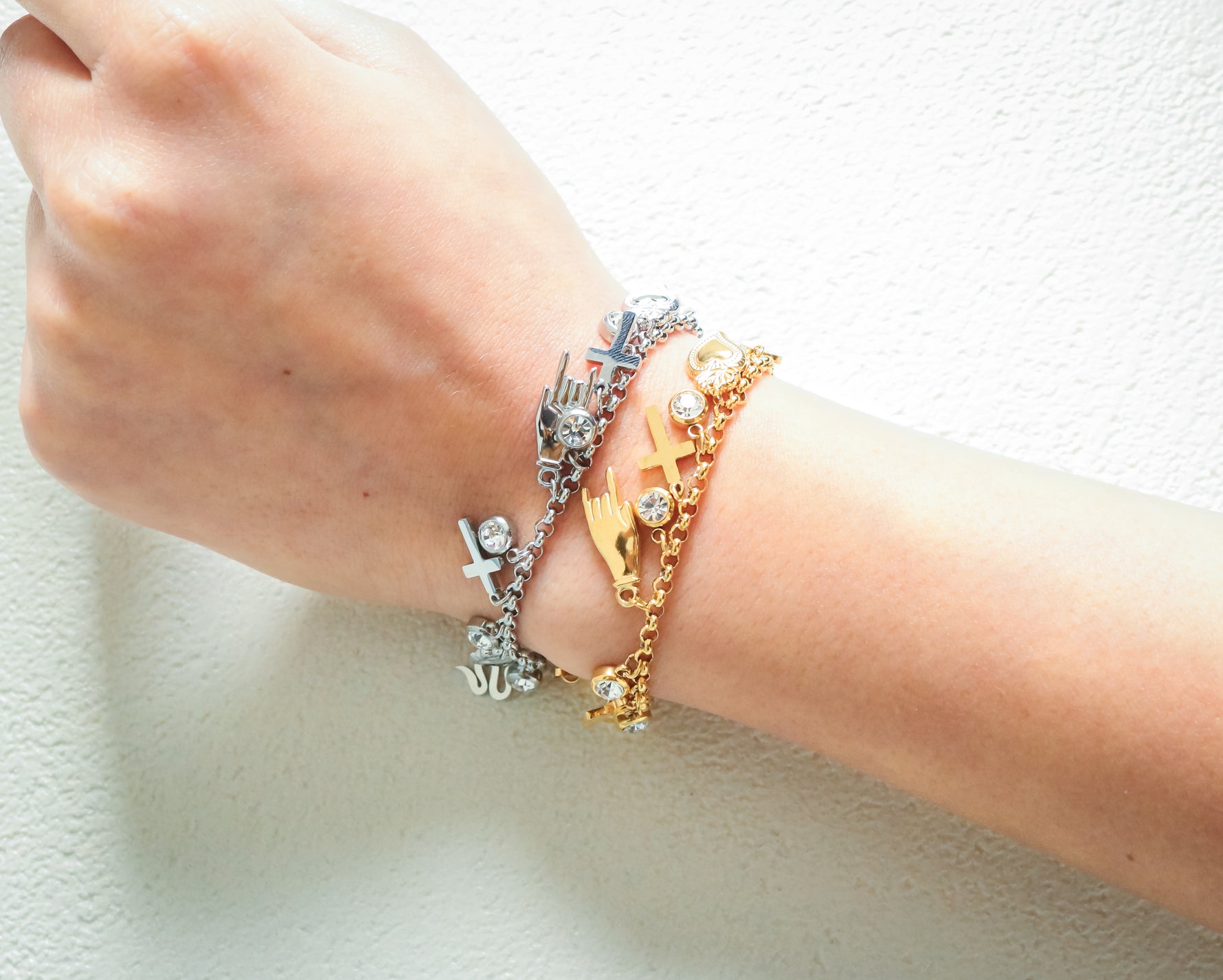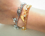 Bracciale con ciondoli pendenti, stile sacro e profano, disponibile in colorazione oro o argento