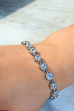 Bracciale a maglia con perline strass. Disponibile in colorazione argento.