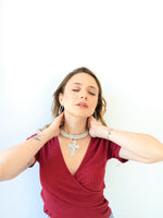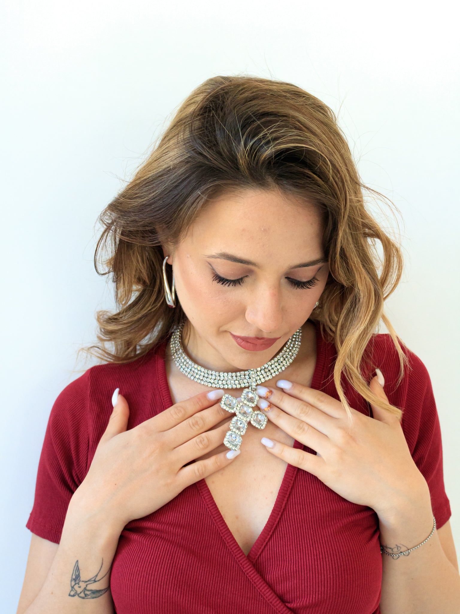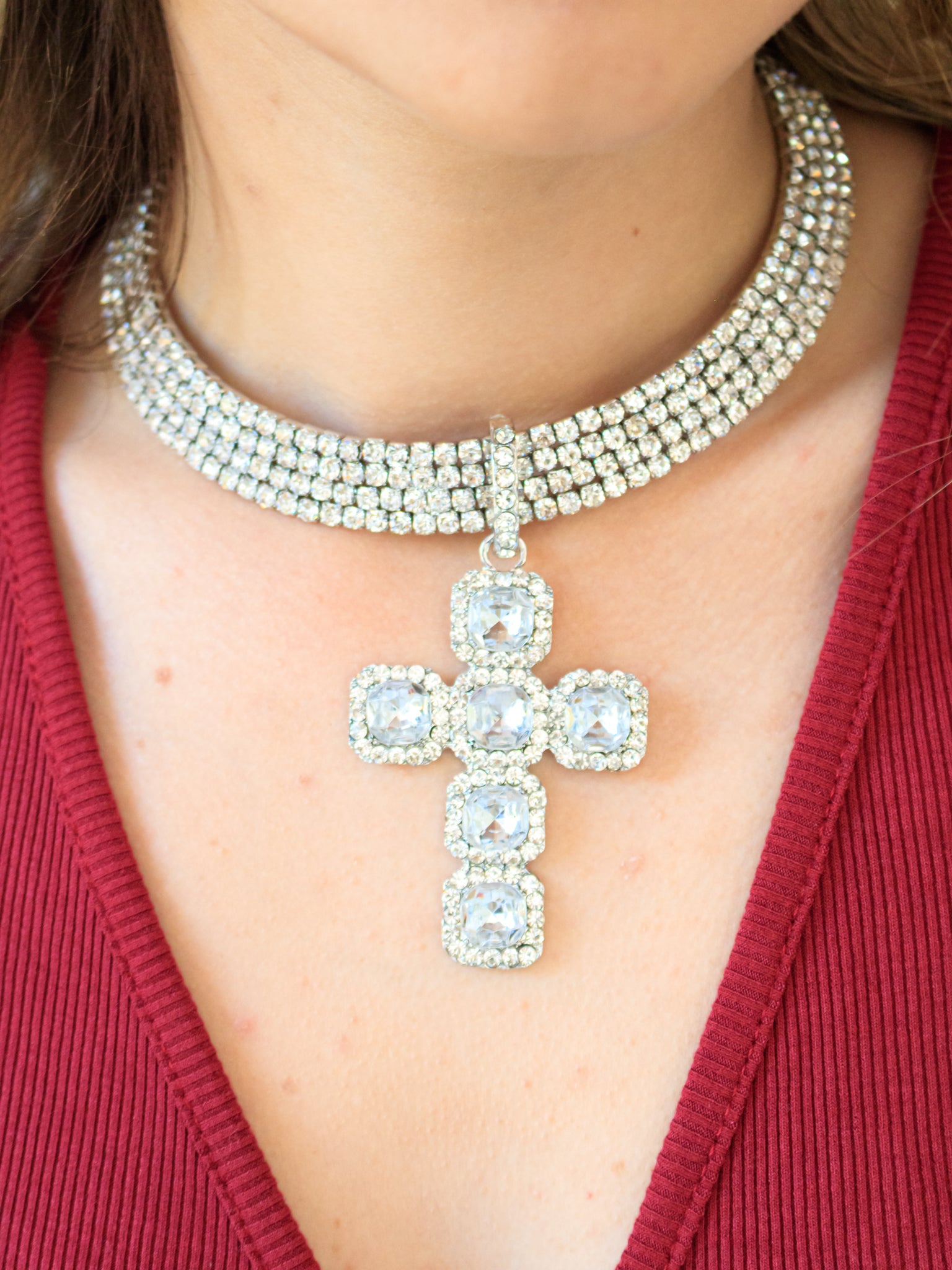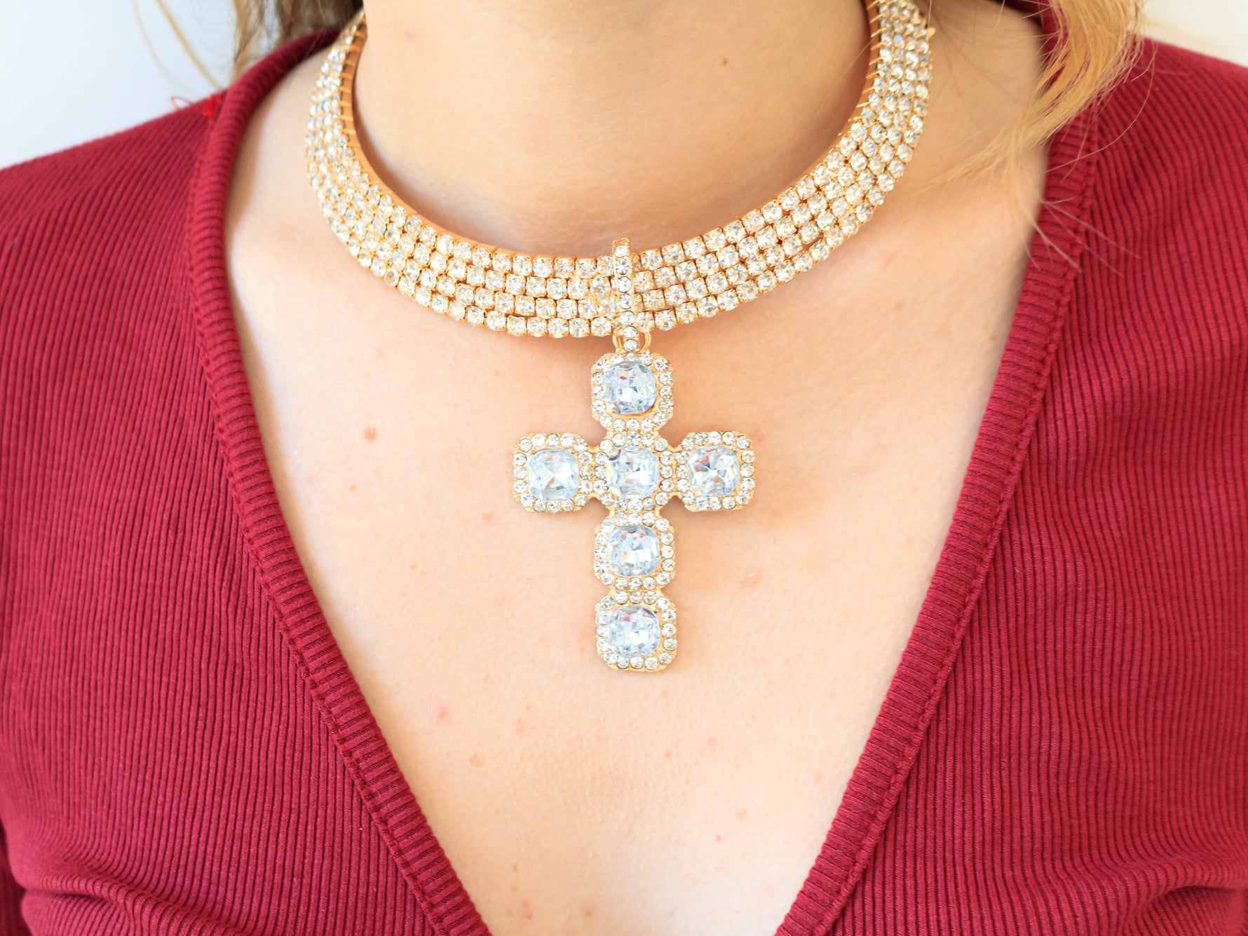 Collana rigida con strass e croce pendente, disponibile in colorazione oro o argento.