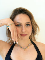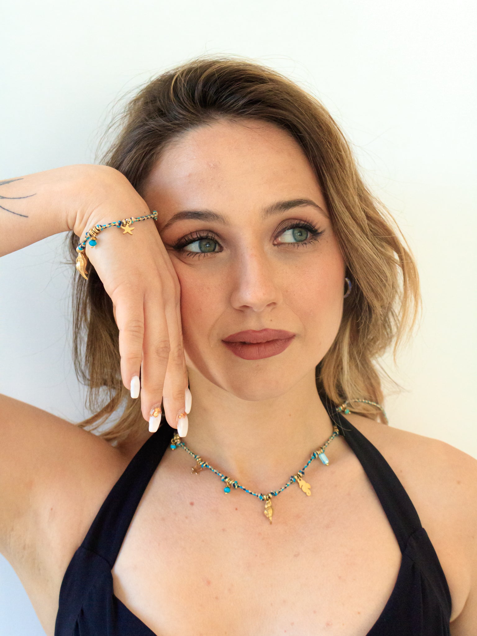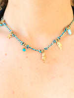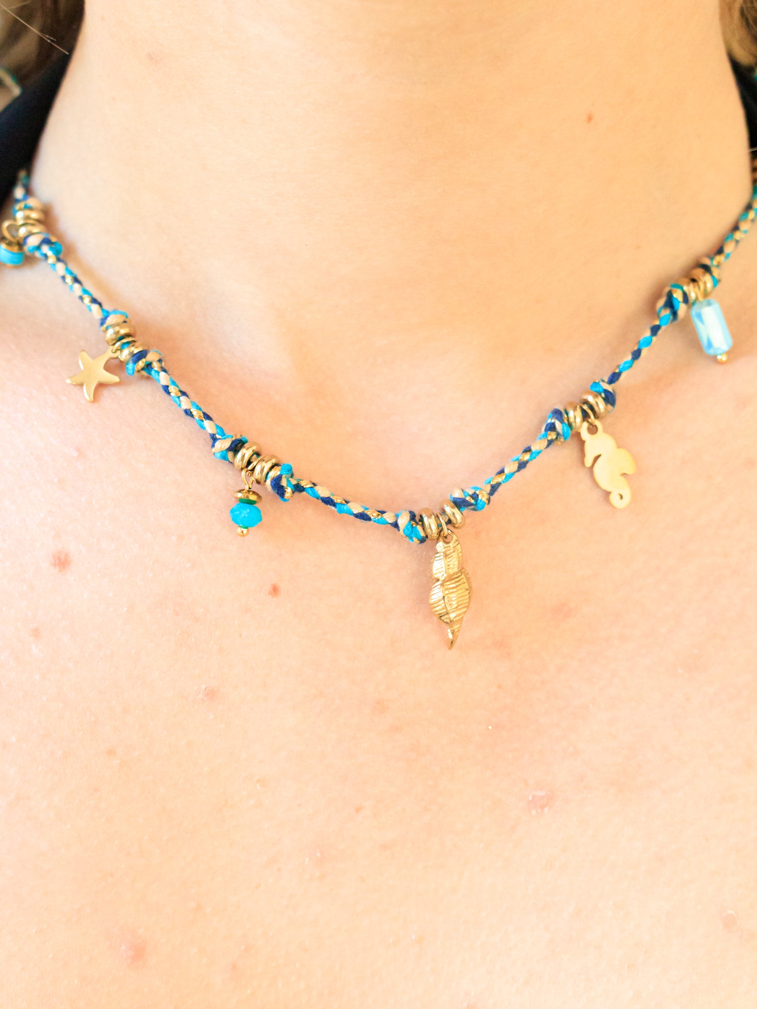 Collana a maglia con piccoli ciondoli e decorazioni marine sui colori dell'oro e del celeste.