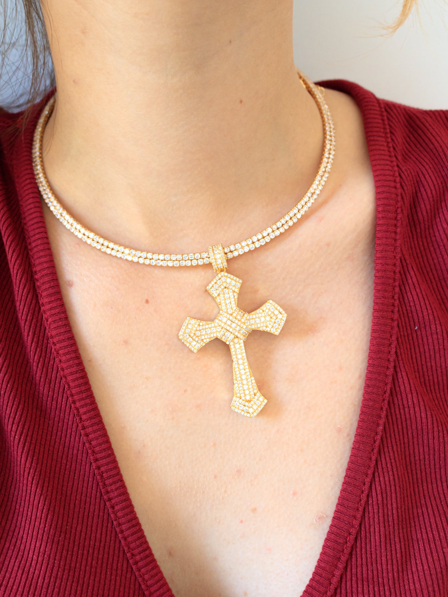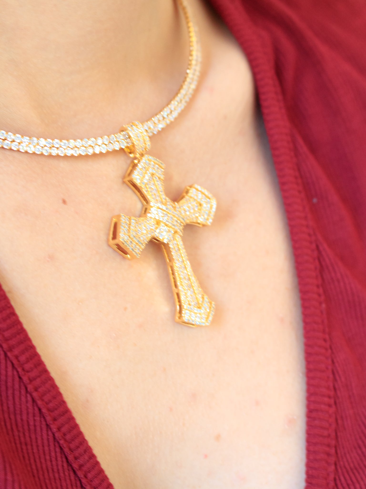 Collana con croce in strass, disponibile in colorazione oro o argento