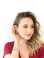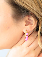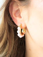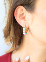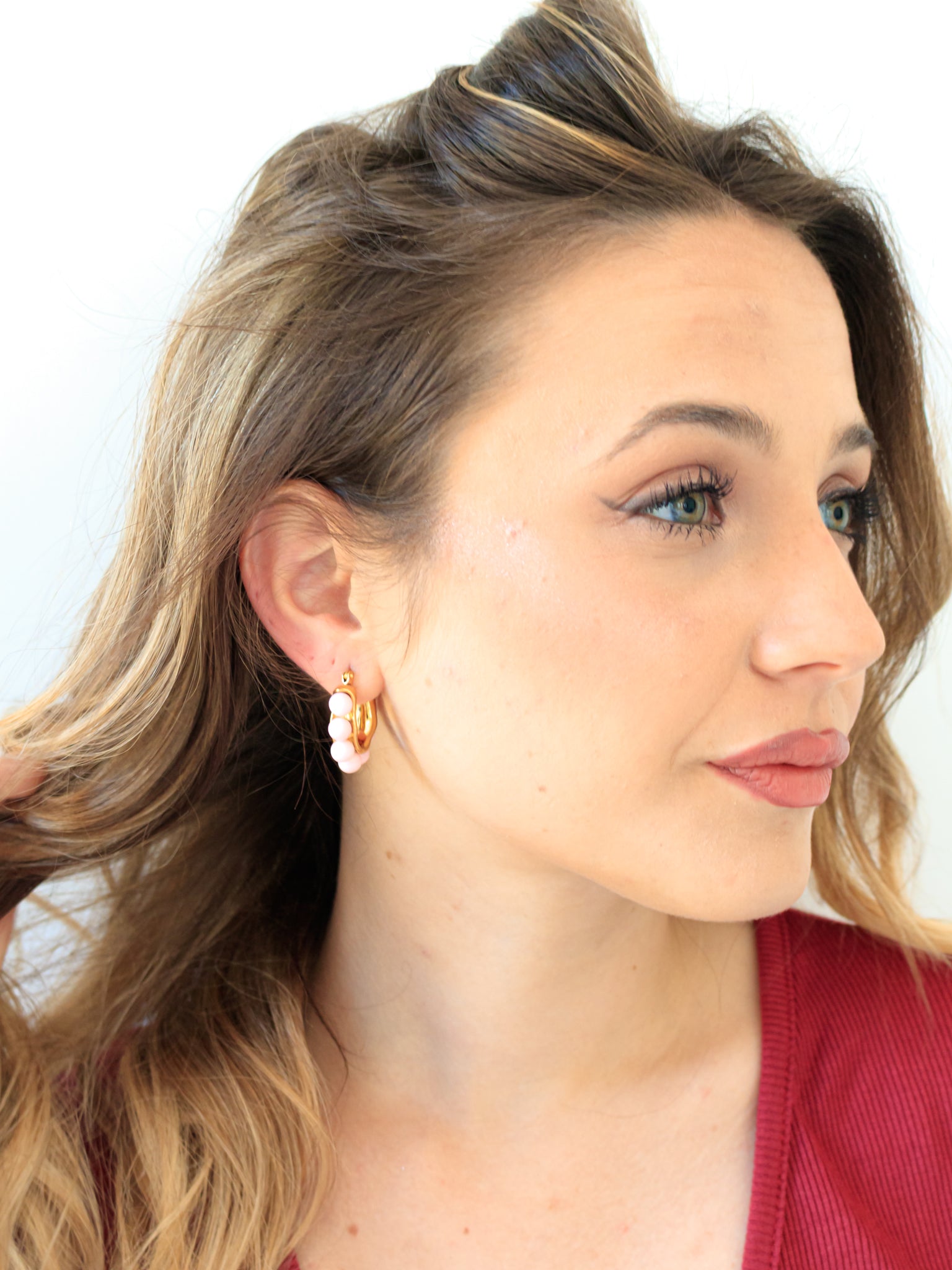 Orecchini a cerchio con perline, disponibili in cinque differenti colorazioni: rosa, bianco, celeste, viola e multicolor.