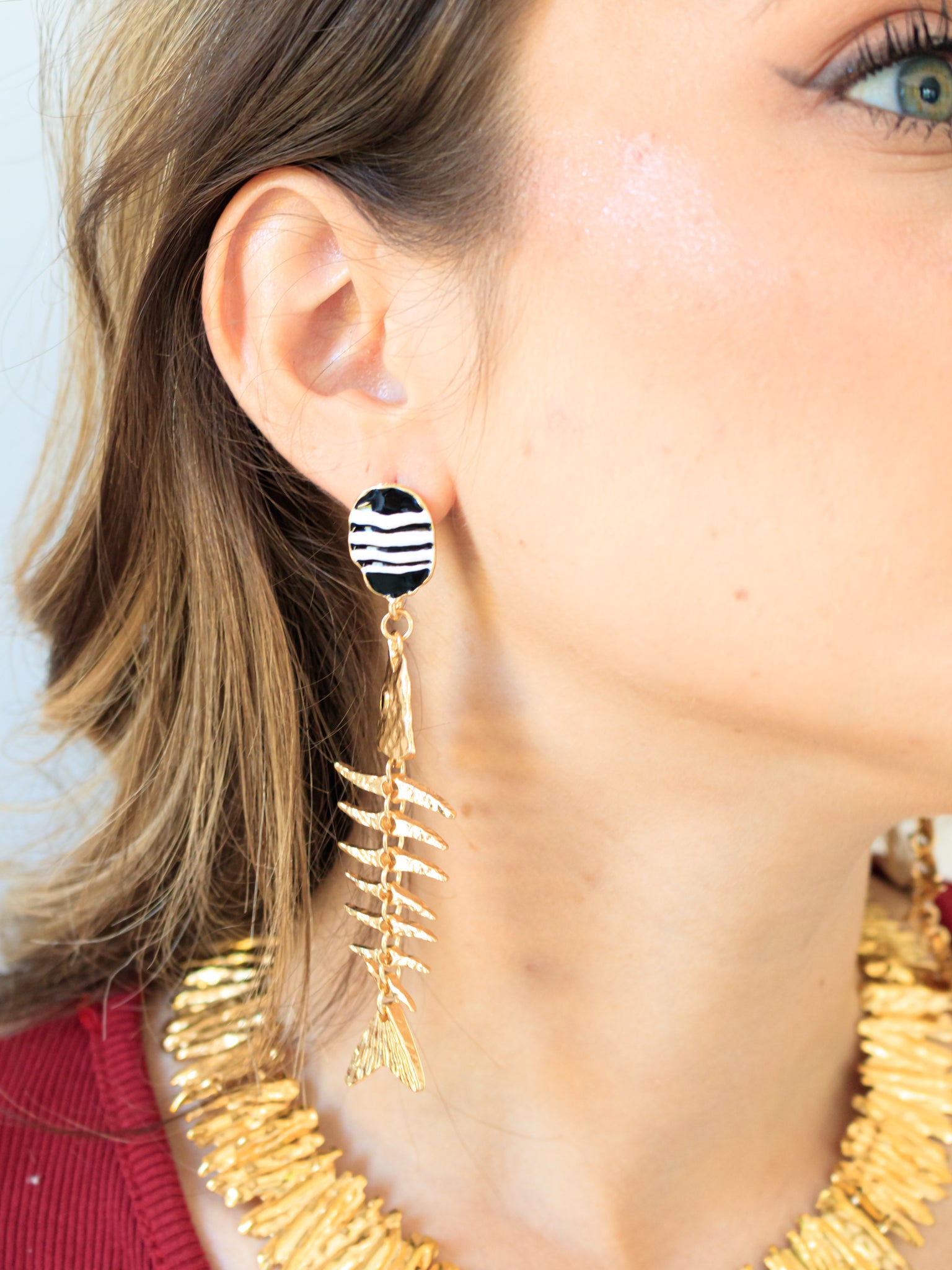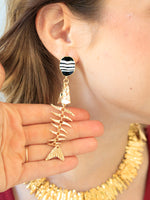Orecchini pendenti con clip colore blu e bianco e sagoma a forma di pesciolino in colorazione oro.