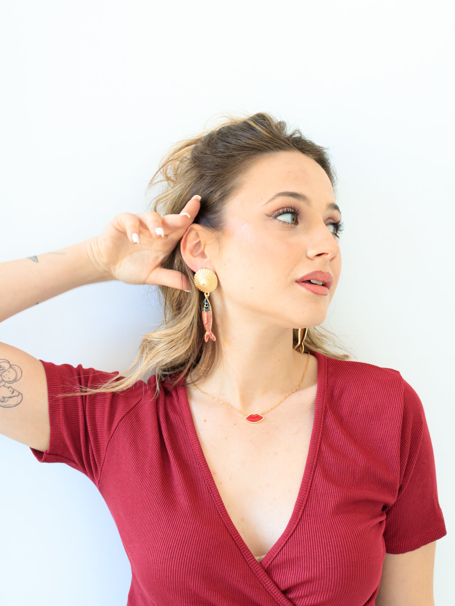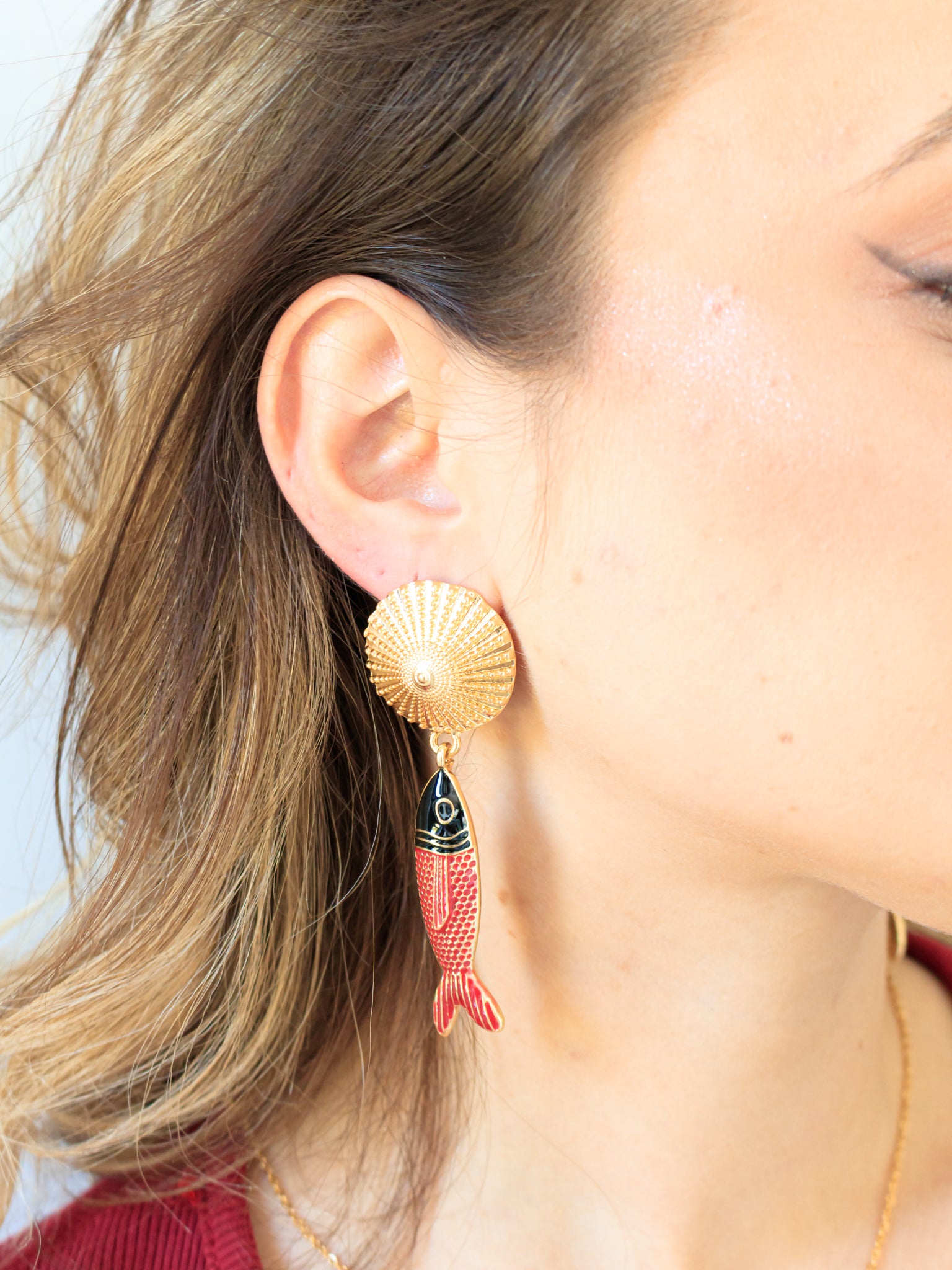 Orecchini pendenti con conchiglia e pesciolino rosso e nero, disponibile in colorazione oro